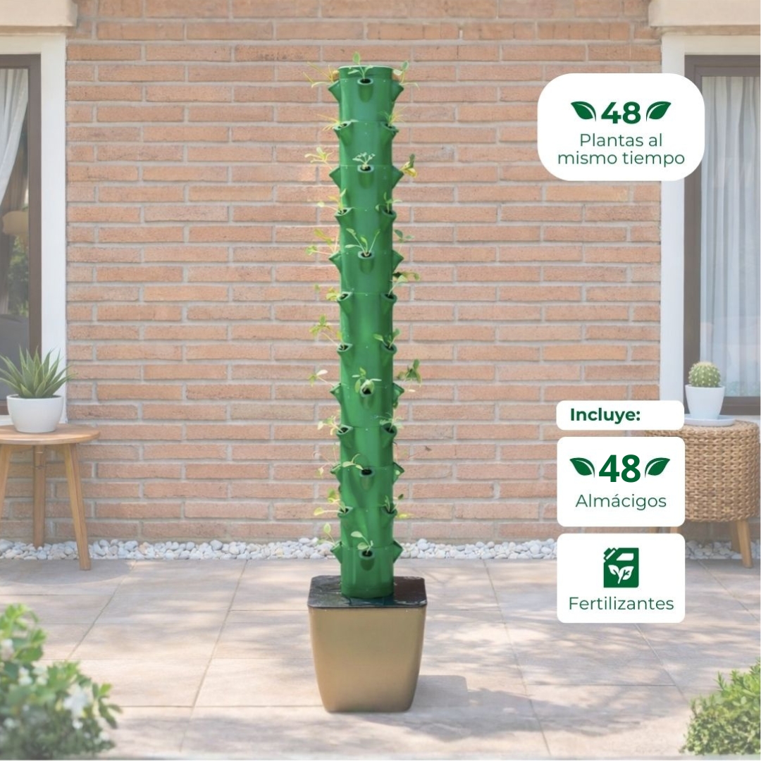 El sistema es prácticamente autónomo. Solo requiere que controles una vez al mes reponer el nivel del agua con la solución nutritiva (fertilizantes A+B) y una limpieza menor en el exterior de la torre para mantener su belleza y colores vivos.